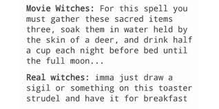 It reads quote Movie witches: For this spell you must gather these sacred items three, soak them in water held by the skin of a deer and drink half a cup each night before bed until the full moon…Real witches: Imma just draw a sigil or something on this toaster strudel and have it for breakfast end quote.