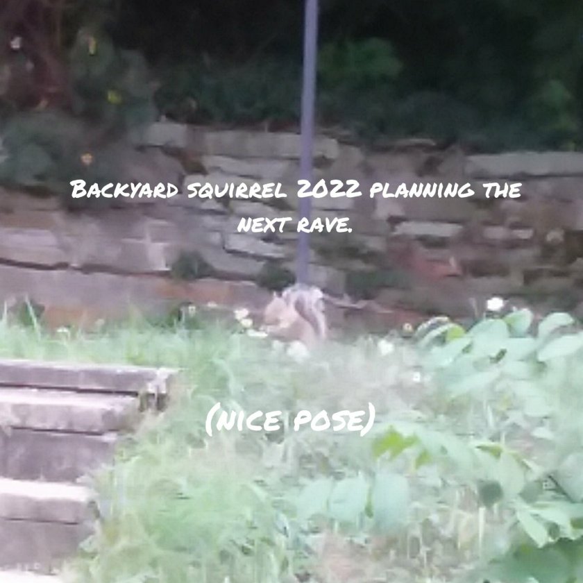 Meanwhile, please enjoy this blurry picture of a squirrel in the planning stages of the next pagan rave. Ducks in a row – bah!