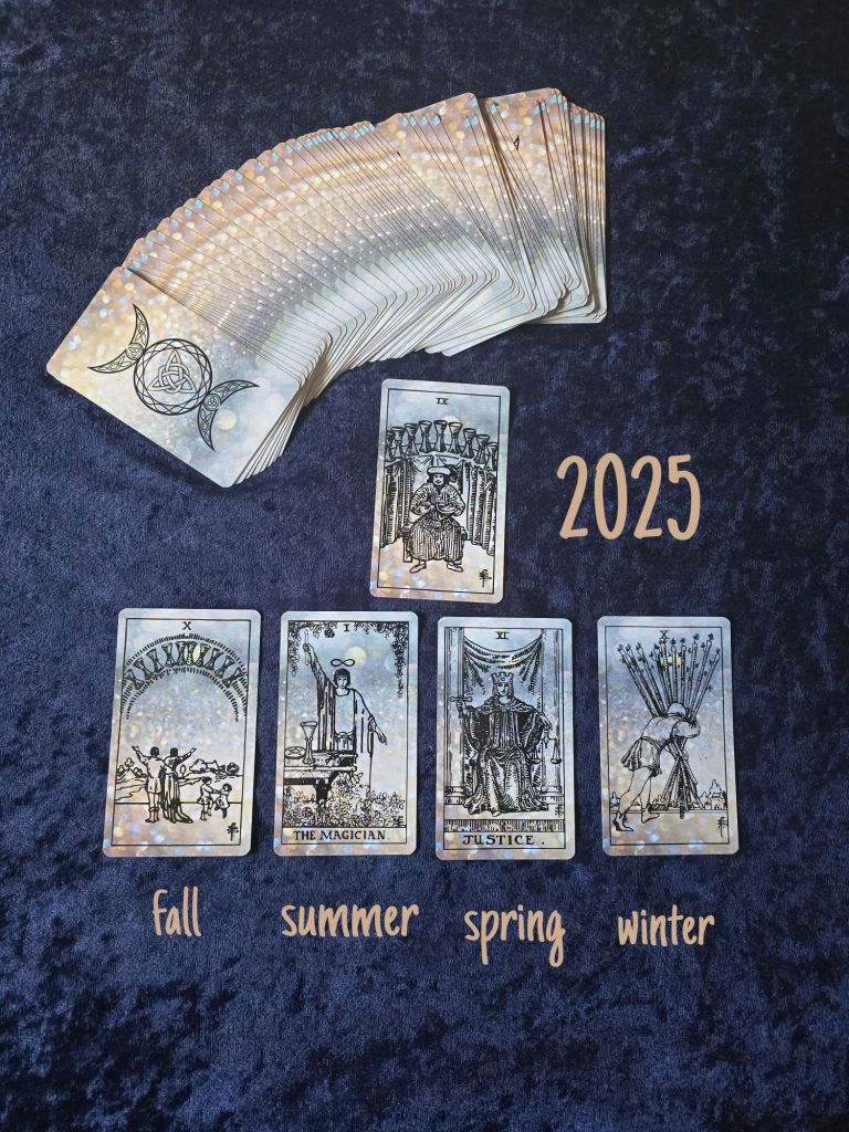 There picture explains the layout. There is one card for each of the next four seasons. It’s winter now, so we begin there and read from right to left. Reading it opposite of English disrupts that logic & flow, and makes it just that tiny bit easier to look and listen to intuition. Someone used the word “Theme” to describe a card. I like that. Each card gives a theme, a thought, a vibe for the season it represents, not a definite prediction. Although I will tell you about mental images (clairvoyance, what I intuitively “see”) or any intuitive sounds / music / words (clairaudience, what I intuitively “hear”) Not that it is a prediction, but because it might mean something to somebody, somewhere. That’s the whole point of doing these so-called collective energy or general audience readings on the blog or social media. It might be of use to somebody somewhere at some point in time whenever they stumble across this.