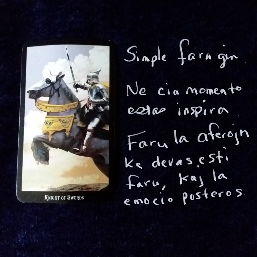 Yep. The Fool. Again. Drew this on July 13, but didn’t post it here until now so I could do the Esperanto translation. If you follow me on Instagram, the fool turned up there as a throwback post on July 10 and it has been a part of a couple of private client readings lately, too. I’m taking it as a hint to revive the “why does this card keep turning up” Q&A.