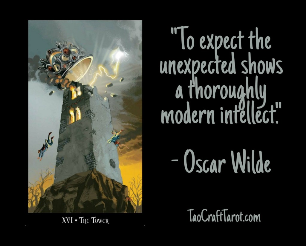 The Tower card is usually associated with sudden chaos, a surprise big event. It makes a sort of practical, real world sense. Tall buildings and trees are more prone to lightning strikes, so it stands to reason that a tower would be a good symbol for a bolt from the blue, literally and figuratively.